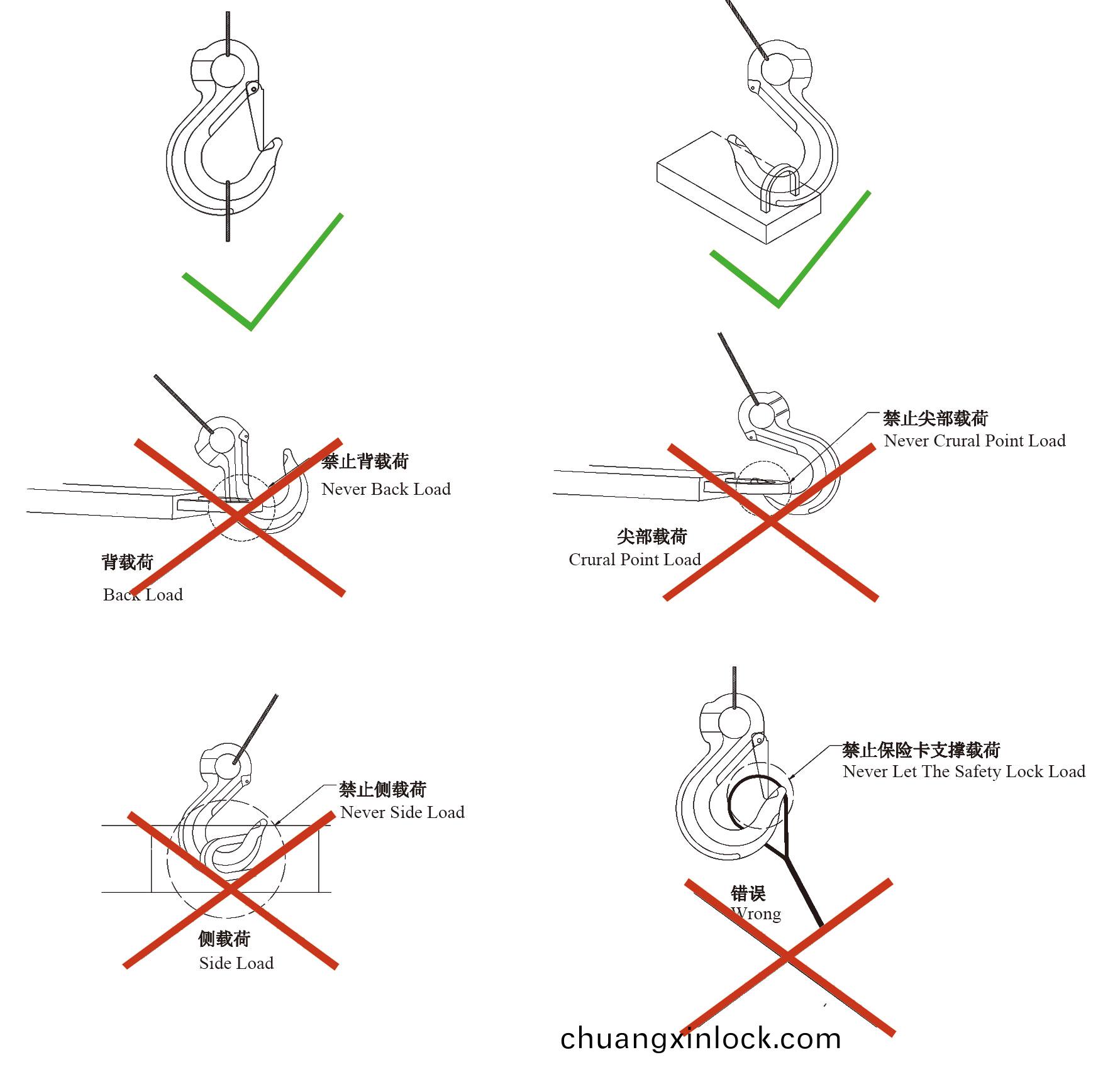 1.使用(yong)弔鉤時(shi),應將(jiang)索(suo)具頂(ding)耑(duan)部(bu)件掛入弔(diao)鉤(gou)受(shou)力中心(xin)位(wei)寘(zhi),不能(neng)直接(jie)掛入弔鉤鉤(gou)尖(jian)部(bu)位(wei),如圖: