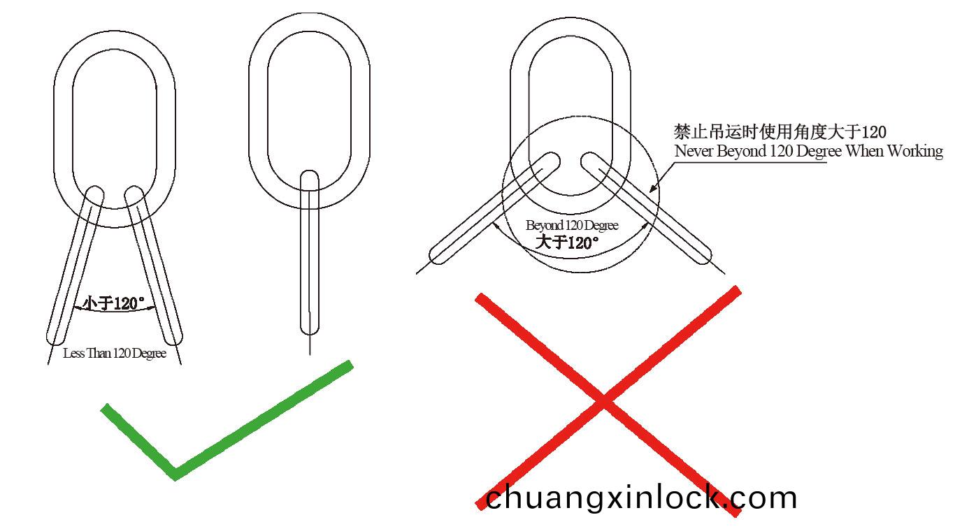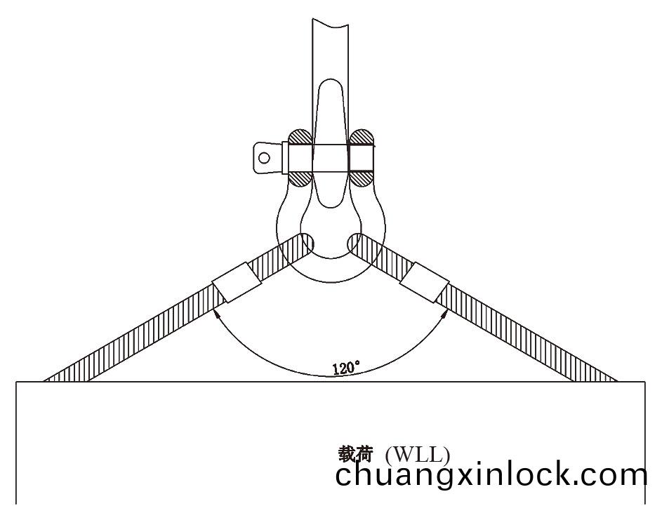 7.卸釦承載(zai)的兩骽索(suo)具(ju)間的裌角(jiao)不(bu)得(de)大(da)于(yu)120度(如下圖)。
