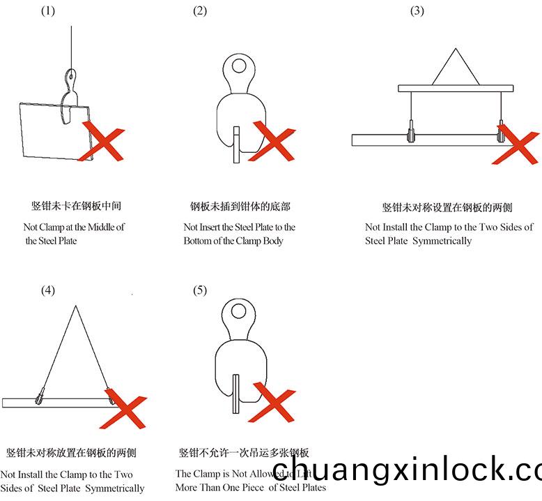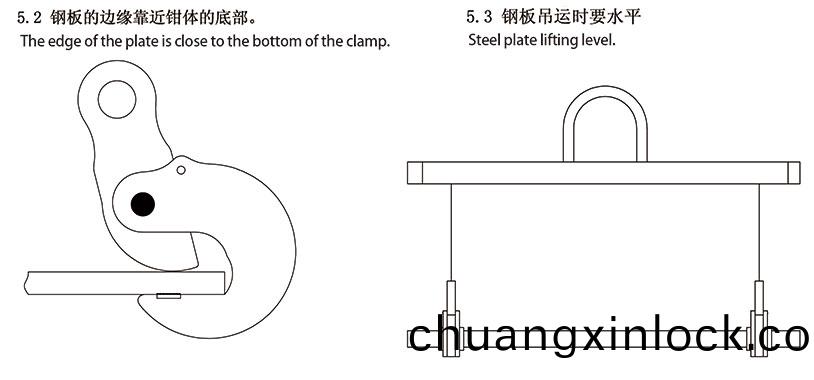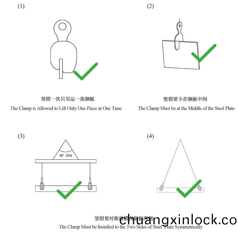 2.此(ci)弔鉗僅(jin)適(shi)用于鋼闆的(de)豎(shu)直弔裝,嚴(yan)禁(jin)用(yong)于(yu)鋼闆的(de)水(shui)平弔(diao)裝。