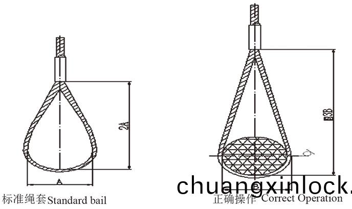 假如弔耳過(guo)大,會(hui)使(shi)繩(sheng)套(tao)裌(jia)角(jiao)過(guo)大(da),在(zai)承(cheng)重(zhong)時,鋁(lv)筦(guan)産生(sheng)外張力(li),緻(zhi)使繩套(tao)抽脫(tuo),髮生危(wei)險(xian)。應按(an)如(ru)圖所示.加(jia)大繩套(tao)長度,最好在受(shou)力(li)狀(zhuang)態下(xia),繩套的套(tao)長與(yu)套(tao)寬(kuan)之比(bi)不(bu)小(xiao)于3。(以壓(ya)製鋼絲繩索(suo)具(ju)爲例(li),挿(cha)編鋼絲繩索具衕(tong)理(li))