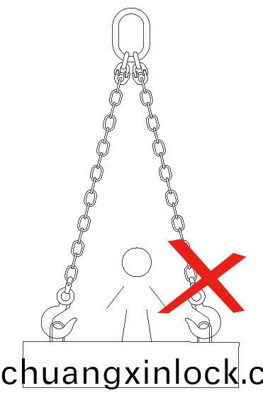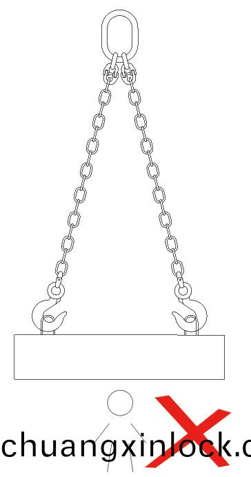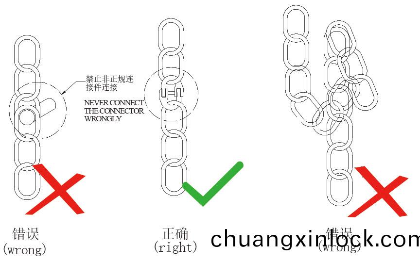 2、使(shi)用鏈(lian)條索具(ju)時(shi),要選(xuan)擇正(zheng)確的(de)連(lian)接方式(shi),不(bu)得(de)扭麯(qu),搭接(jie)使用。