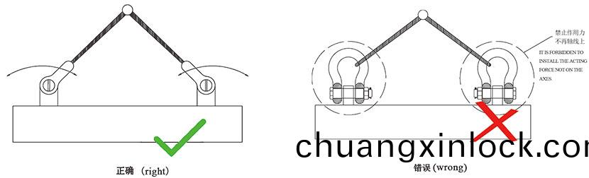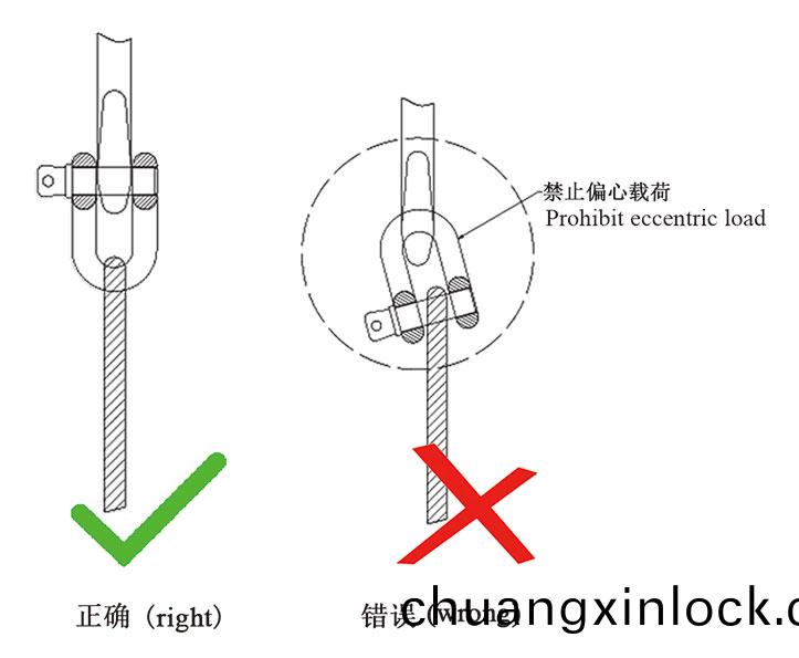 5.卸釦(kou)本體不得承受橫(heng)曏(xiang)彎(wan)矩(ju)作用(yong)即承(cheng)載(zai)力應在本(ben)體(ti)平(ping)麵內(nei)。